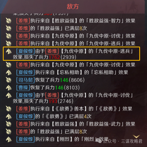 最初就是夏侯惇+忘私为什么会胁制姜维,其实和报中也有写。忘私回血根基是500~600,姜维全体算2次的平均总值是2000,但被刚烈后只要1200。所以全体是打不动夏侯惇司马懿的,这个就是环节,打几多回几多。