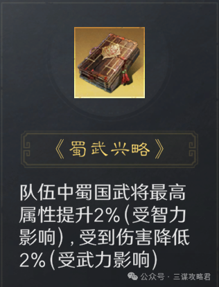 姜维的《蜀武兴略》韬略能够再给全队加20点智力和4%摆布的减伤(白板姜维),若是是满红姜维会加的更多,很强。