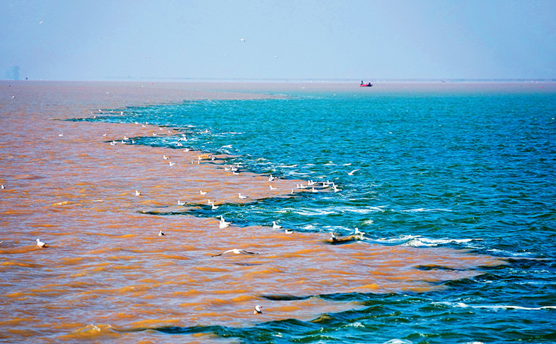近年来,得益于久久为功的修复办法,位于黄河入海口的山东黄河三角洲国度级天然区,变成水草丰茂、生物多样性富集的大湿地,成为国际候鸟迁飞的“国际机场”,每年迁移颠末的鸟类达数百万只。图为2024年10月11日正在黄河入海口拍摄的黄河水取海水构成明显颜色对比的奇特景不雅。 记者 徐速绘/摄。