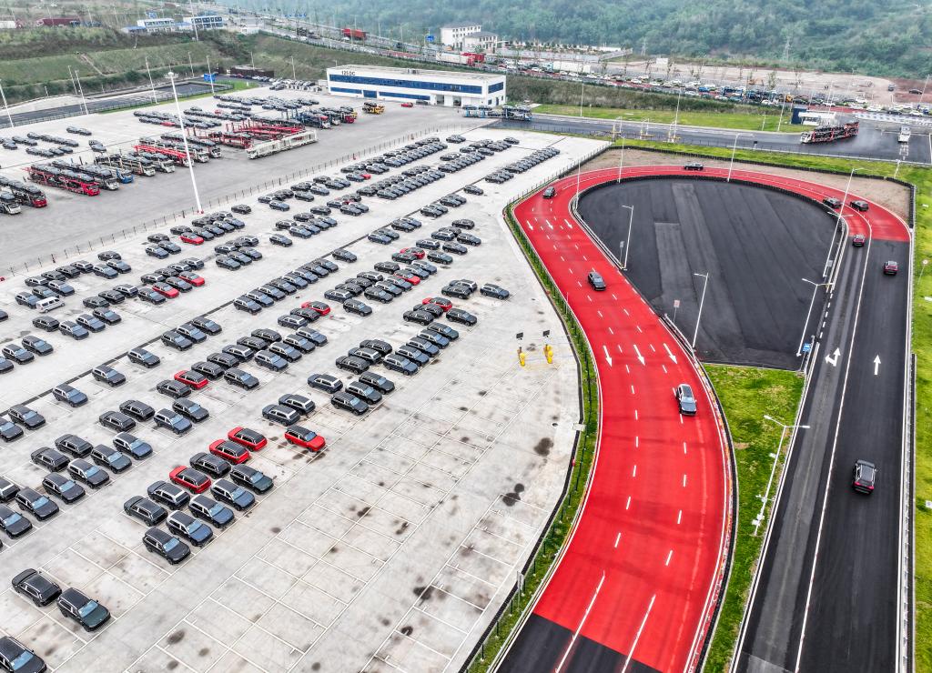 2024年11月6日正在位于两江新区的赛力斯超等工场拍摄的新能源汽车(无人机照片)。记者 王全超 摄。